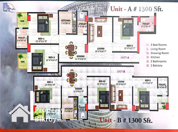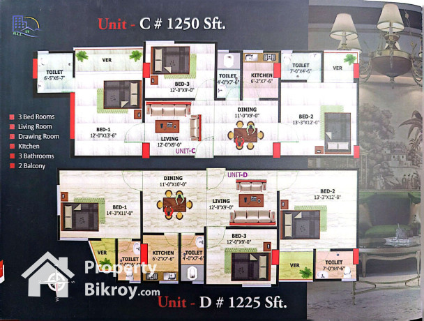 * ফ্ল্যাট সাইজ : টাইপ: এ - ১৩০০ বর্গফুট, বি- ১৩০০ বর্গফুট , সি - ১২৫০ বর্গফুট ডি -১২২৫ বর্গফুট, ই- ১২৬০বর্গফুট